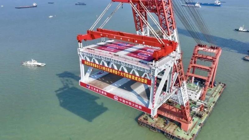 2月1日上午 中鐵大橋局承建的常泰長江大橋 主航道橋首個1280噸的鋼梁吊裝完成 巨力索具1900噸大節段鋼梁吊具 全程保障該項目吊裝順利進行 贏得兔年“開門紅” 為公司實現一季度開門紅創造有利條件本次吊裝為常泰長江大橋主航道橋常州側邊跨首個大節段鋼梁,更是全橋首個大節段鋼梁,此次鋼梁吊裝完成,標志著常泰長江大橋建設又邁出堅實的一步。鋼梁吊裝至滑移支架上后,將通過拖拉滑移系統拖拉300m至設計位置。