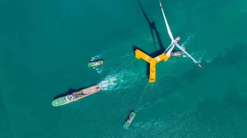 近日,從廣東茂名港出發(fā)的中國首臺浮式風電機組于7月11日成功抵達陽江海上風電場并開始進行系泊索安裝。