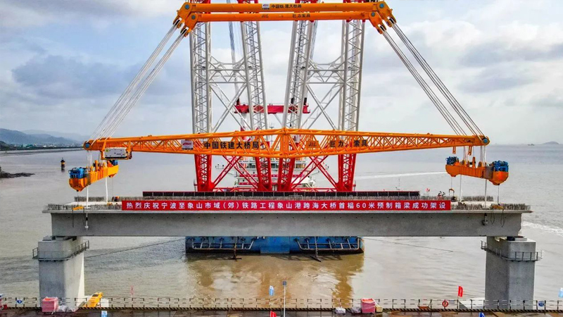 11月5日,隨著現(xiàn)場指揮一聲令下,國內(nèi)首座市域(郊)鐵路跨海大橋,重1700噸的預(yù)制箱梁穩(wěn)穩(wěn)落至橋墩上,巨力索具箱梁吊具全程保障首榀箱梁成功架設(shè),標(biāo)志著大橋全面進(jìn)入上部結(jié)構(gòu)施工階段。