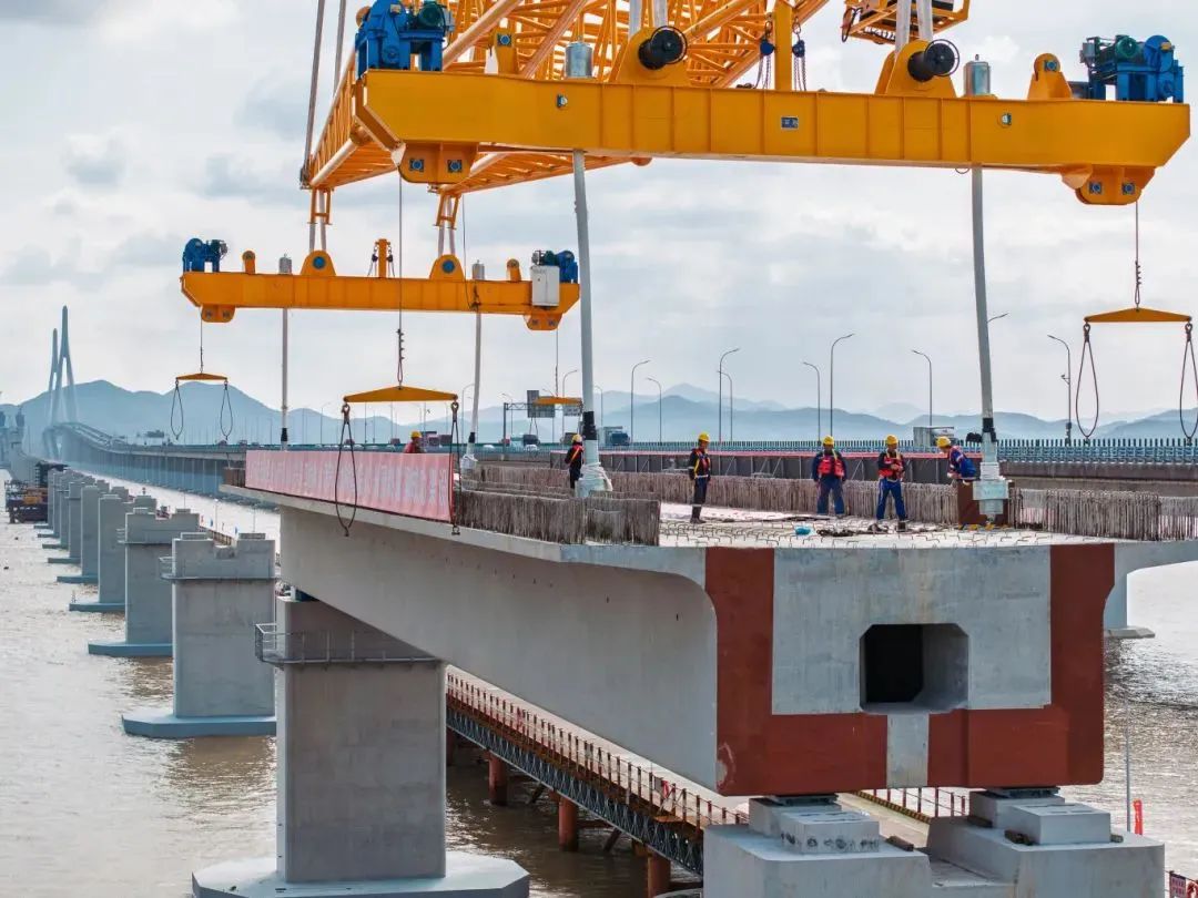 11月5日,隨著現(xiàn)場(chǎng)指揮一聲令下,國(guó)內(nèi)首座市域(郊)鐵路跨海大橋,重1700噸的預(yù)制箱梁穩(wěn)穩(wěn)落至橋墩上,巨力索具箱梁吊具全程保障首榀箱梁成功架設(shè),標(biāo)志著大橋全面進(jìn)入上部結(jié)構(gòu)施工階段。