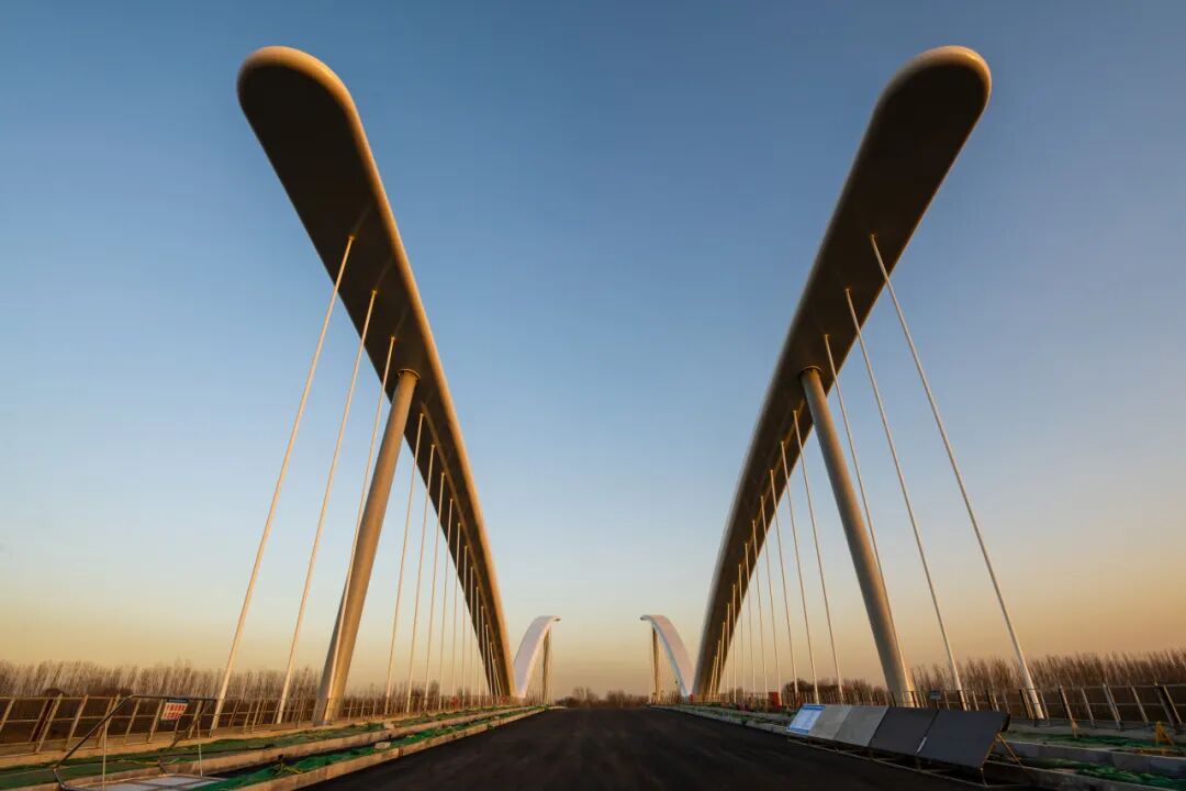 大橋全長(zhǎng)259米,造型以鷺鷥涉水時(shí)舒展的羽翼為原型,取展翅翱翔,高飛于空的意境,將人文理念融合于雄安灣生態(tài)自然的景觀中。以“展翅高飛”為景觀主題,塑造整體協(xié)調(diào)、重點(diǎn)突出的夜間燈光效果,營(yíng)造“清新、亮麗、現(xiàn)代、雅致“的夜間橋梁景觀形象。橋梁全線有功能照明和可分級(jí)控制的景觀照明,為平日和節(jié)日提供不同的照明效果。