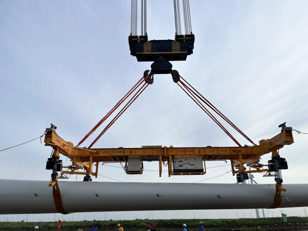 8月29日,由巨力索具股份有限公司為東方電氣風(fēng)電股份有限公司專(zhuān)項(xiàng)研制的26MW海上風(fēng)電機(jī)組用大噸位單葉片吊具及大扭矩盤(pán)車(chē)系統(tǒng),已于山東東營(yíng)風(fēng)電裝備測(cè)試認(rèn)證創(chuàng)新基地成功完成吊裝作業(yè)。這是目前國(guó)內(nèi)外最大兆瓦海上風(fēng)電機(jī)組葉片吊裝的優(yōu)異解決方案,創(chuàng)新型解決了最大葉片的吊裝難題。