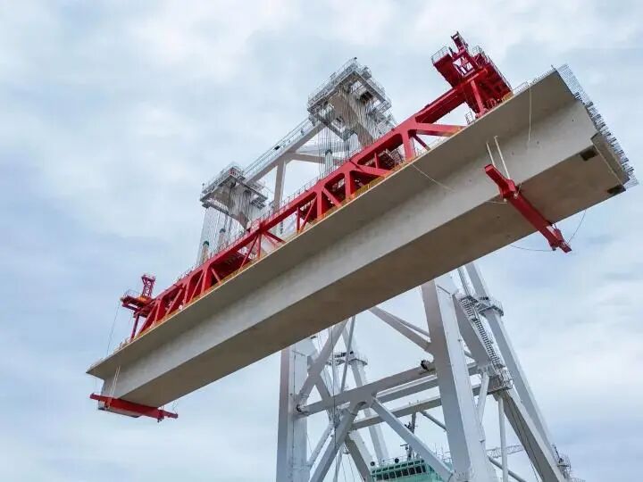 巨力索具生產(chǎn)制造的預(yù)制箱梁吊具與中鐵大橋局研制的“天一號(hào)”運(yùn)架一體船協(xié)同作戰(zhàn),采用“低平潮取梁、漲潮期運(yùn)輸、平潮期落梁”的精準(zhǔn)調(diào)度方案,克服了海域潮汐變化大、海上風(fēng)浪干擾強(qiáng)、運(yùn)輸距離長(zhǎng)等諸多施工難題,將落梁誤差控制在毫米級(jí),最終將這新一代“世界梁王”架設(shè)到位。