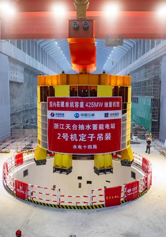 世界最高水頭抽蓄電站——浙江天臺抽水蓄能電站2號機組定子就位工作,巨力索具為其定制了配置八組起吊桿的定子吊具,確保其能夠承受巨大拉力和沖擊力。