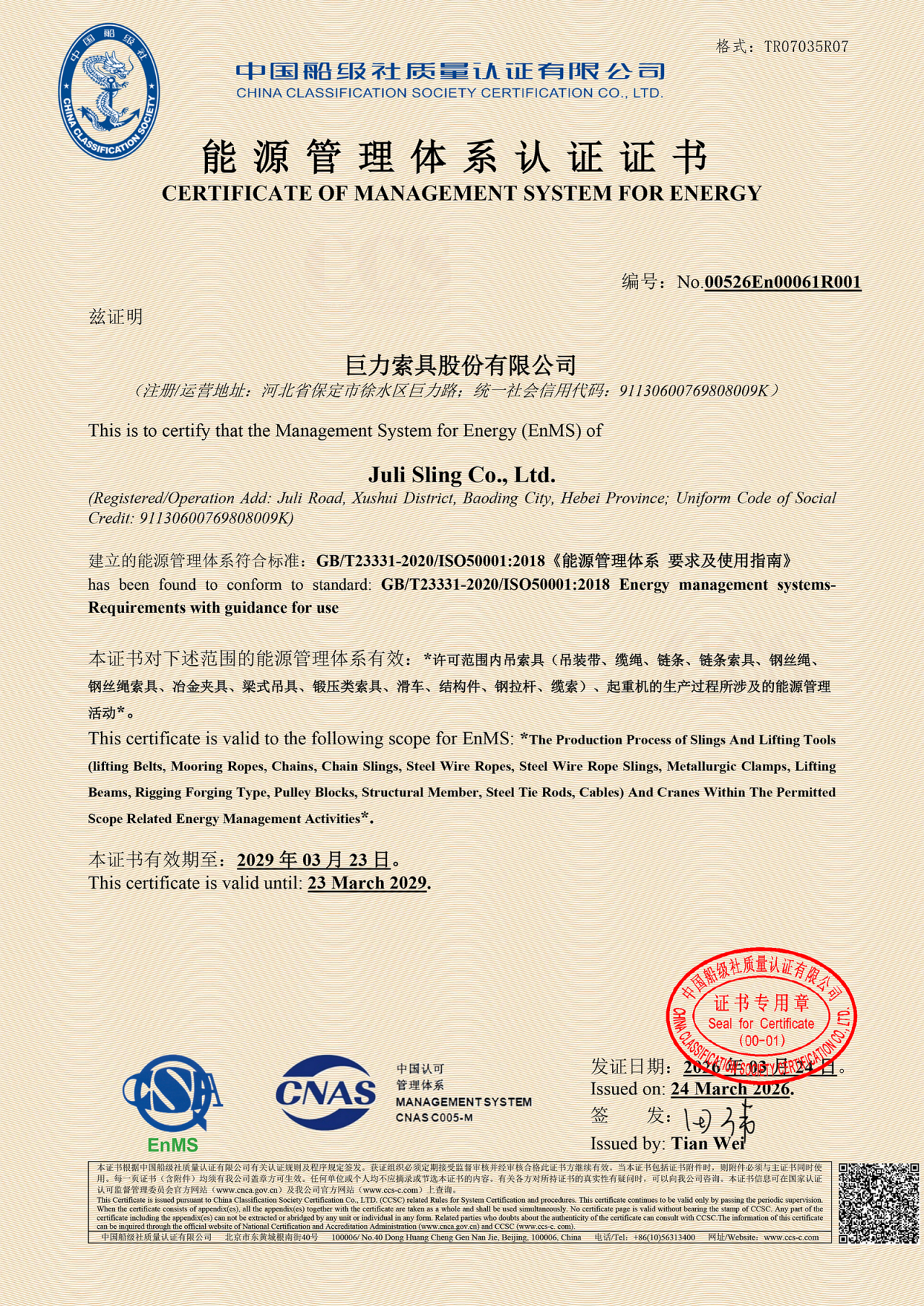 3月24日,巨力索具能源管理體系正式通過中國船級社(CCS)質量認證有限公司認證,斬獲能源管理體系認證證書!這不僅是對巨力索具在能源管理、綠色低碳方面的權威認可,更是對巨力索具企業規范化、標準化管理的充分肯定。