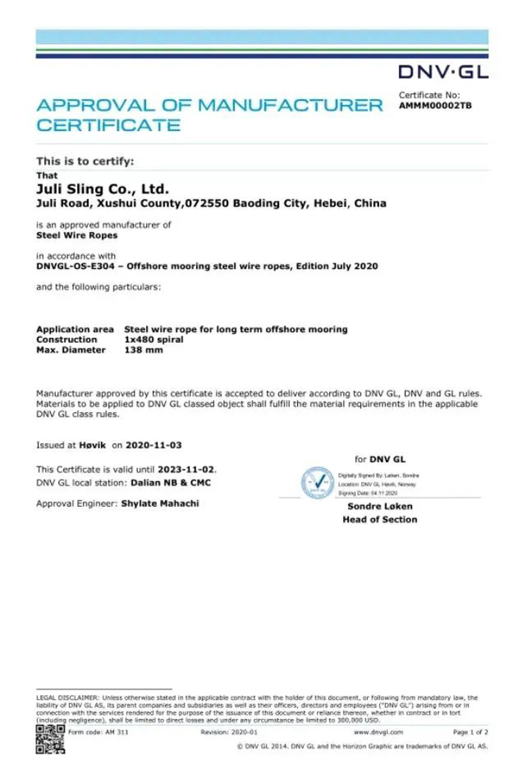 同時,巨力索具系泊產(chǎn)品通過了DNV·GL工廠認證成為國內(nèi)首家通過該類鋼絲繩DNV·GL工廠認可的廠家。系泊索各項指標達到了國際先進水平,標志著我國浮式海上風電永久系泊關(guān)鍵裝備的研發(fā)設(shè)計、生產(chǎn)制造以及國產(chǎn)化上實現(xiàn)了新突破,為我國深遠海浮式風電商業(yè)化發(fā)展以及關(guān)鍵技術(shù)及裝備國產(chǎn)化奠定了堅實基礎(chǔ)。