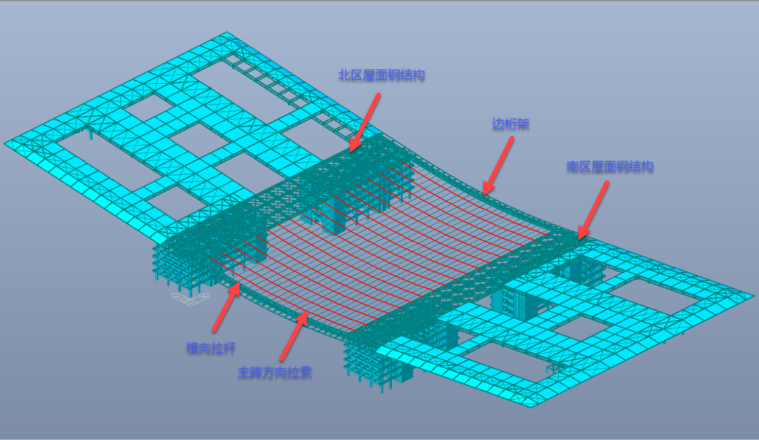 就拿高難度的拉索安裝來說,矢高約3.5米的超大弧形懸索鋼屋蓋,每榀桁架起吊后,需要找到最適宜的角度做成傾斜狀態(tài)。其中最長的桁架,連續(xù)跨度可達120米左右。大屋面由“雙向鋼桁架+跨中拉索結構”組成,中央?yún)^(qū)域110米全懸空的懸鏈態(tài)由兩側邊桁架及中間36根直徑為70毫米的不銹鋼拉索組成,施工牽引張拉、精度、溫度、雙索的扭曲偏轉是無可回避的難題。