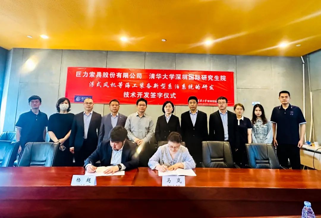 2023年4月13日,巨力索具與清華大學(xué)深圳國(guó)際研究生院就浮式風(fēng)機(jī)等海上漂浮式構(gòu)筑物新型系泊系統(tǒng)的研發(fā)達(dá)成技術(shù)開(kāi)發(fā)合作關(guān)系并舉行簽約儀式。